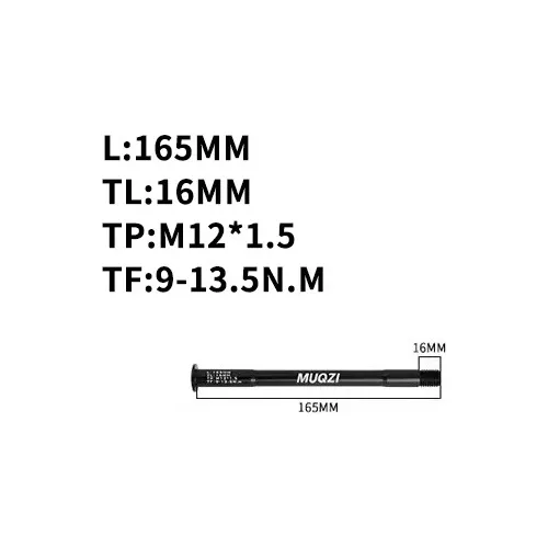 Eje pasante trasero 12x165mmLargo total 165mmDiámetro 12mmLargo rosca 16mmRosca M12x1.5mmAluminio mecanizado CNCPar apriete 9-13NmPeso 34gr