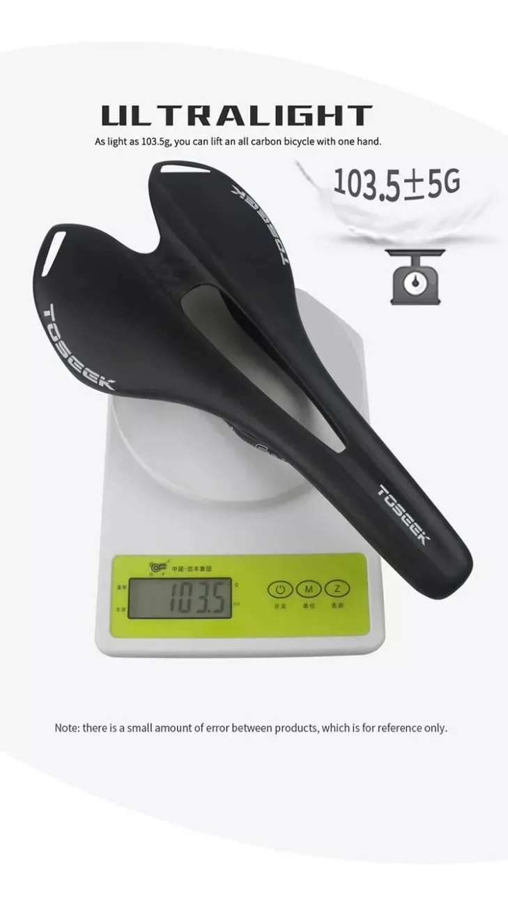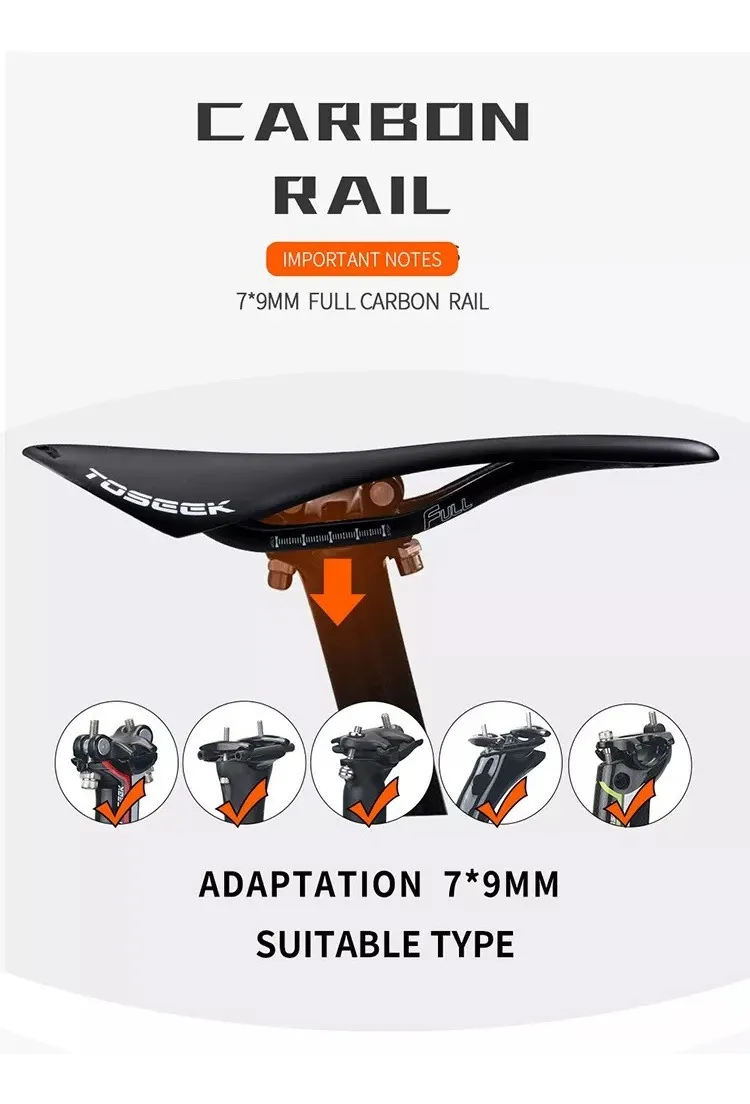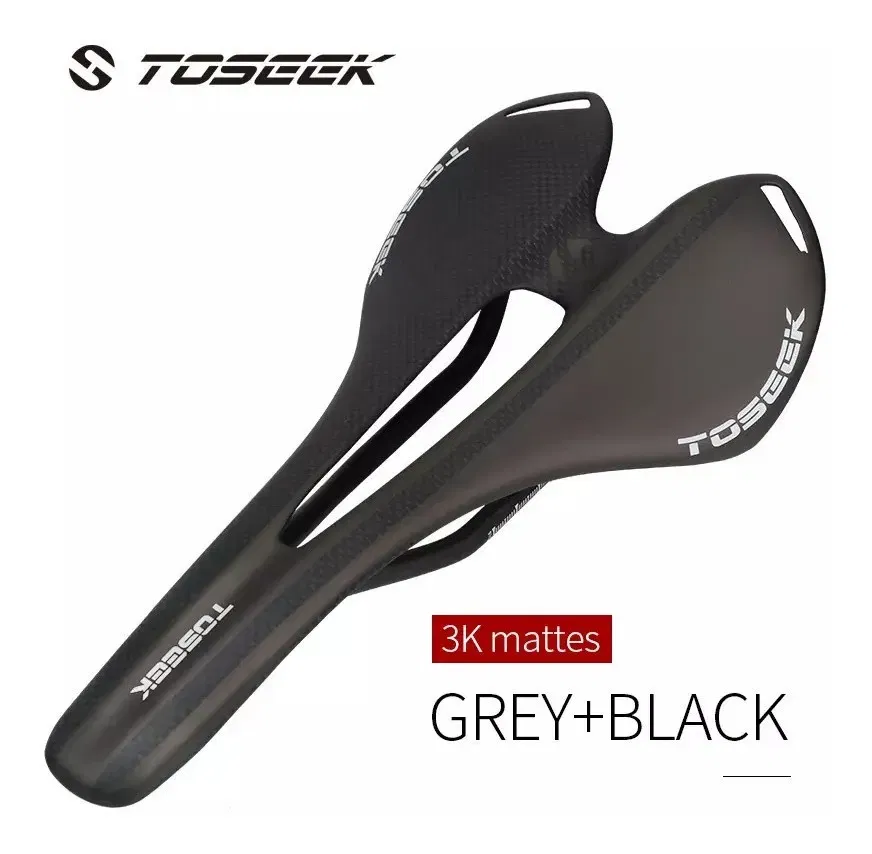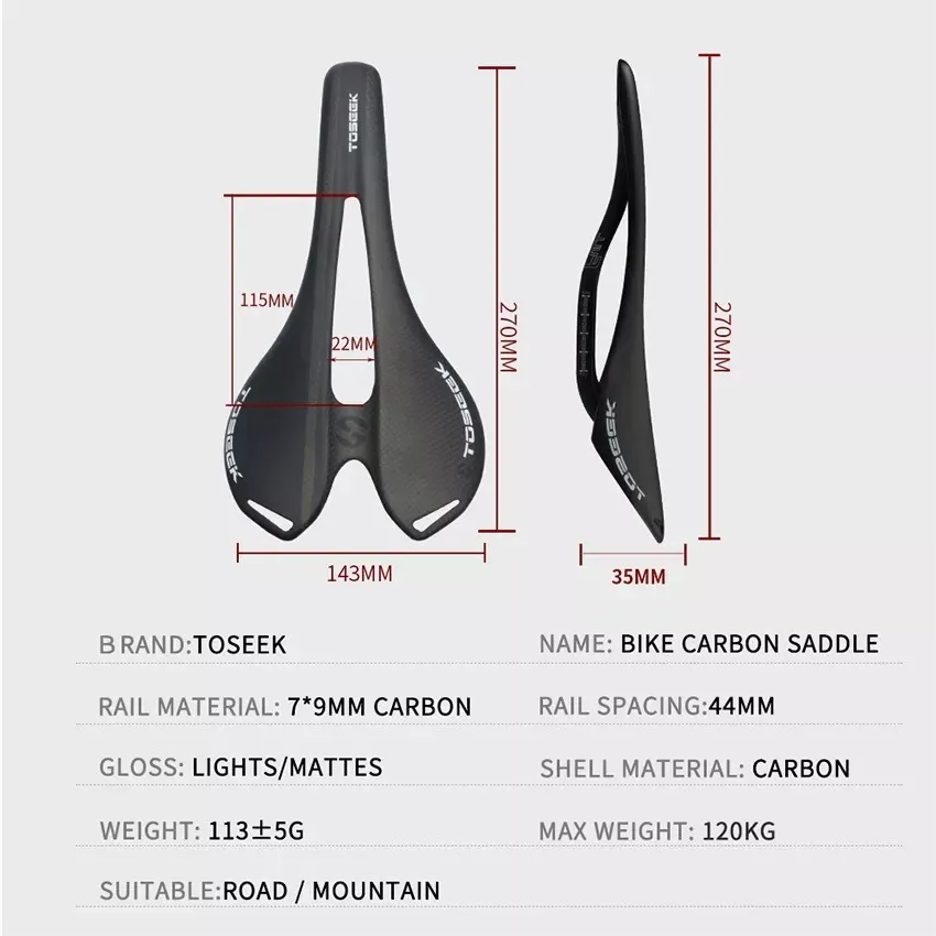 Asiento Full CarbonoMarca ToseekColor Negro mateRieles ovalados carbono 7x9mmTorque grampa rieles 6NmPeso máximo soportado 100KgMedidas 270mm x 143mmPeso 107grUso recomendado Ruta, no apto para XC, DH, AM